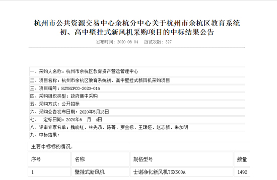 2020年6月4日,杭州市公共資源交易中心余杭分中心關(guān)于杭州市余杭區(qū)教育系統(tǒng)初、高中壁掛式新風(fēng)機(jī)采購(gòu)項(xiàng)目的中標(biāo)結(jié)果公示,士諾繼2019年中標(biāo)杭州市余杭區(qū)教育系統(tǒng)公辦幼兒園及小學(xué)單體式新風(fēng)機(jī)項(xiàng)目之后,士諾壁掛式新風(fēng)機(jī)TSX500A再度中標(biāo),成為唯一一家連續(xù)兩年中標(biāo)余杭區(qū)教育系統(tǒng)新風(fēng)項(xiàng)目的新風(fēng)品牌。